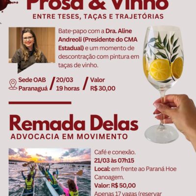 Uma semana especial para a advocacia feminina em Paranaguá. Dois eventos, duas experiências diferentes. 🍷 PROSA & VINHO – Entre teses, taças e trajetóriasUm encontro leve e inspirador com a Dra. Aline Andreoli, presidente do CMA Estadual.Teremos bate-papo, pintura em taças de vinho, além de coquetel e vinho para tornar...