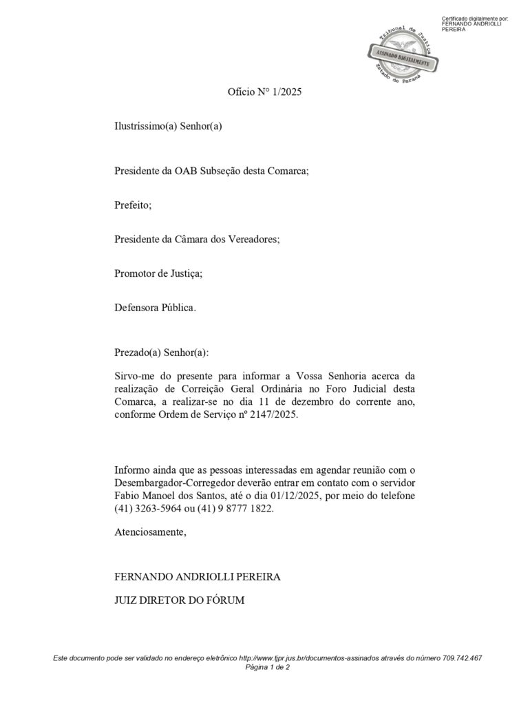 Ofício Circular Correição do Foro Judicial na Comarca de Morretes Em NotíciasPostou 11 de novembro de 2025